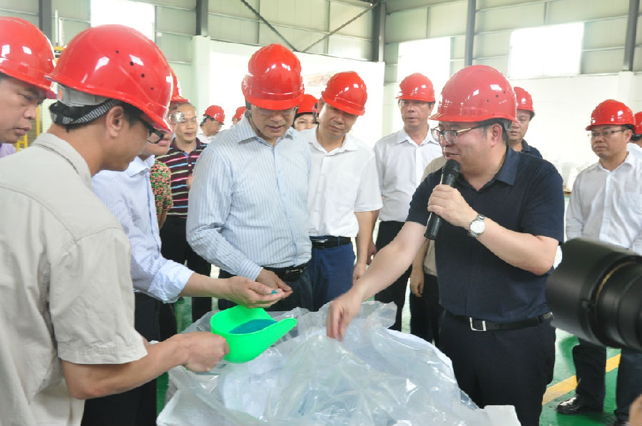 玉林市市委書記莫恭明、市長蘇海棠一行在參看鎳鹽車間剛產(chǎn)出的六水硫酸鎳產(chǎn)品